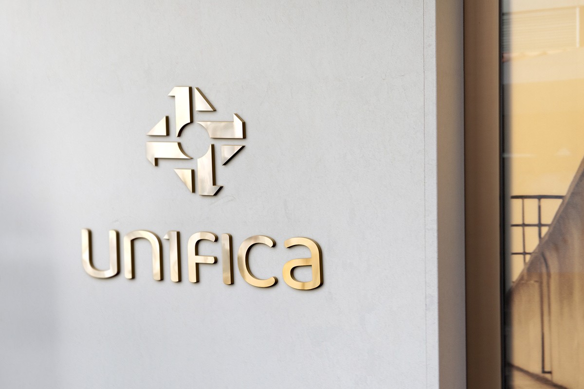 Branding:The isotype is composed of the number one, repeated four times in a North, South, East, and West pattern, suggesting a compass rose while forming a central circle to symbolize unity, an apropos echo of the company brand.In place of the letter, I in UNIFICA, the wordmark uses the numeral 1 to form UN1FICA, which serves to emphasize the company’s leadership position in the target market as well as reiterate the core concept of unity or oneness.